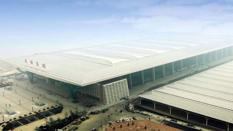 成都火車東站位于成都市東三環(huán)路,2010年開始建設,車站面積約22萬平方米。在設計上引入了大量的文化元素,東、西廣場的進出口都用了三星堆的青銅面具元素,屋頂引入了金沙太陽神鳥的火焰造型,被定為一等客運站。使用了寶鋼鍍鋁鋅
