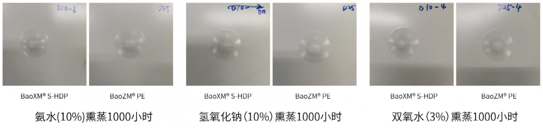 采用BaoZM®和BaoXM®基板的S-HDP涂層或者聚酯(PE)涂層鋼板經(jīng)過杯凸加工后,在1000小時氨水、氫氧化鈉、雙氧水熏蒸下,涂層均完整。