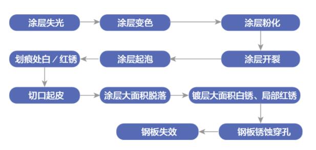 彩涂鋼板的失效過程如下圖所示,涂層失效、鍍層失效乃至鋼板穿孔是關(guān)鍵的腐蝕發(fā)生過程。因此提高涂鍍層厚度,且采用耐候、耐蝕涂鍍層是最有效的防止彩涂鋼板腐蝕失效的手段。