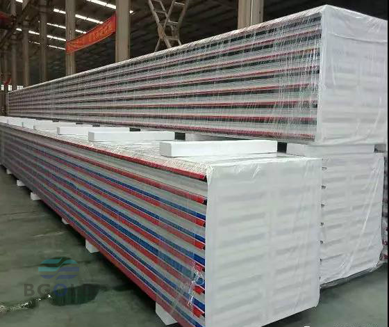 3、在第一塊板就位合適后,依次安裝就位第二塊,并應主導風向鋪設。板間密封時可用鐵釘臨時固定在夾芯板側(cè)面。