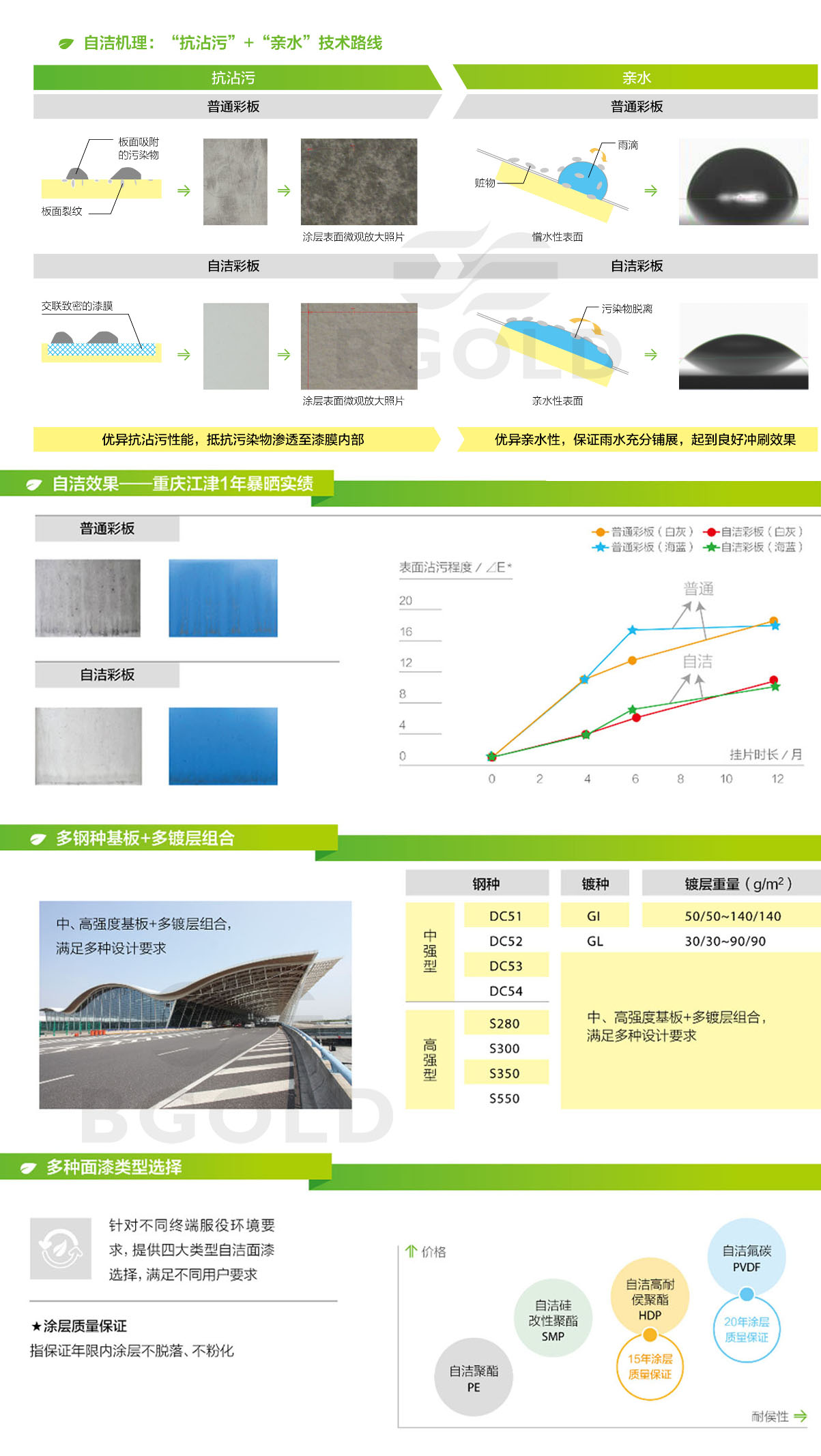 自潔彩板是一種新型的戶外建筑用彩涂鋼板。自清潔系列彩涂鋼板是寶