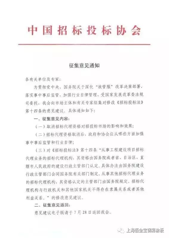 7月31日,受?chē)?guó)家發(fā)改委法規(guī)司委托,中國(guó)招標(biāo)投標(biāo)協(xié)會(huì)將組織市場(chǎng)主體、業(yè)內(nèi)專家學(xué)者,就《招標(biāo)投標(biāo)法》第十四條關(guān)于工程招標(biāo)代理機(jī)構(gòu)資質(zhì)管理的條款修訂收集意見(jiàn)。